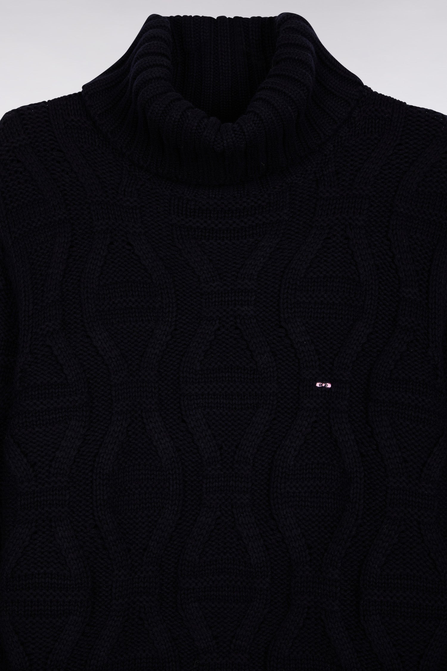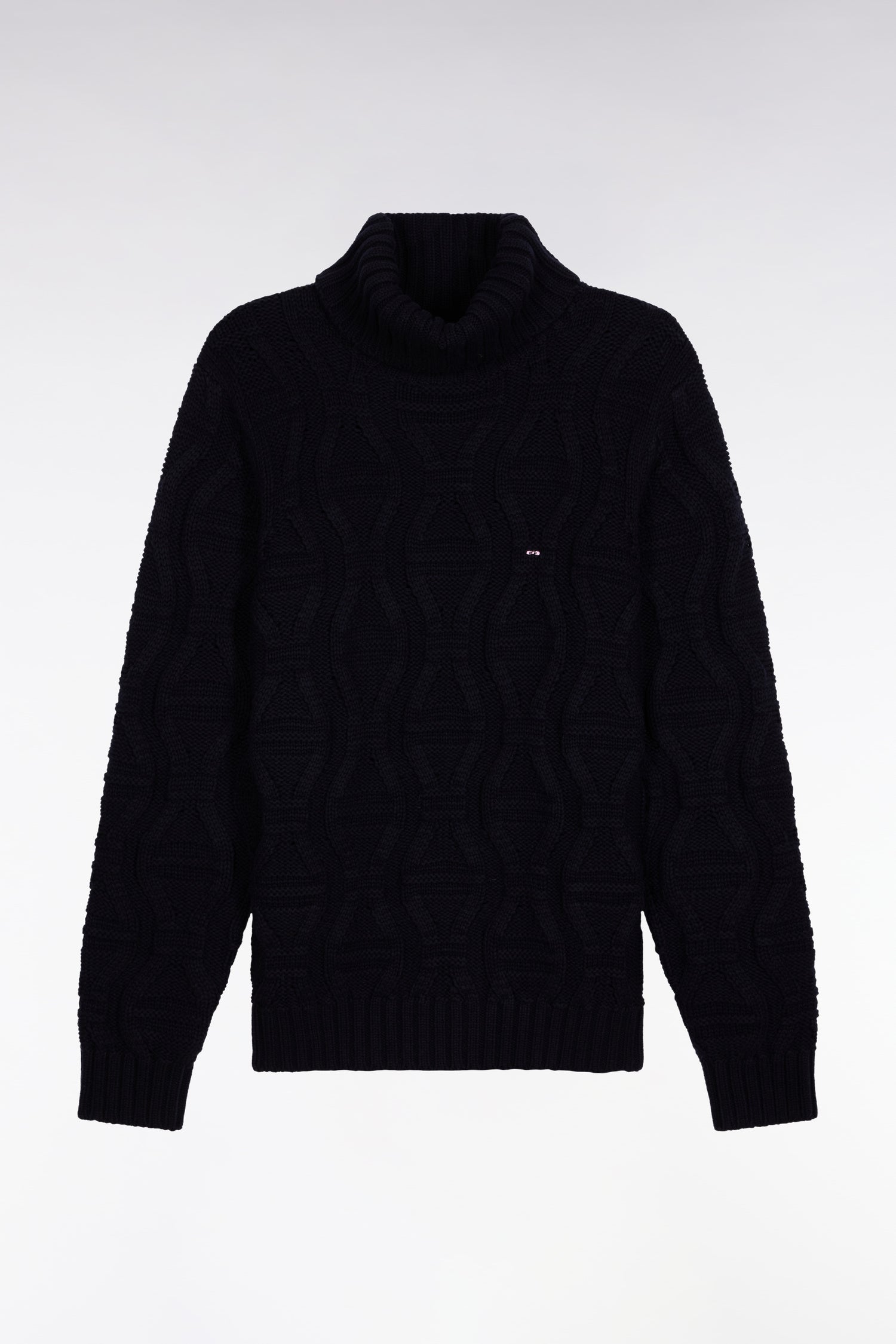 Knitted in our dense, comfortable signature yarn, a combination of wool and cotton, this chunky turtleneck sweater is a must-have for men's winter wardrobes. Its knitting plays on the subtle alternation of bow ties, the House's graphic signature revisited in the manner of a twist. Soft, warm and structured, this navy blue sweater boasts meticulous rib-knit finishing and emblem embroidery at the bottom of the piece. An exceptional piece that you'll love to wear every winter. Pair with raw denim jeans in the heart of winter.