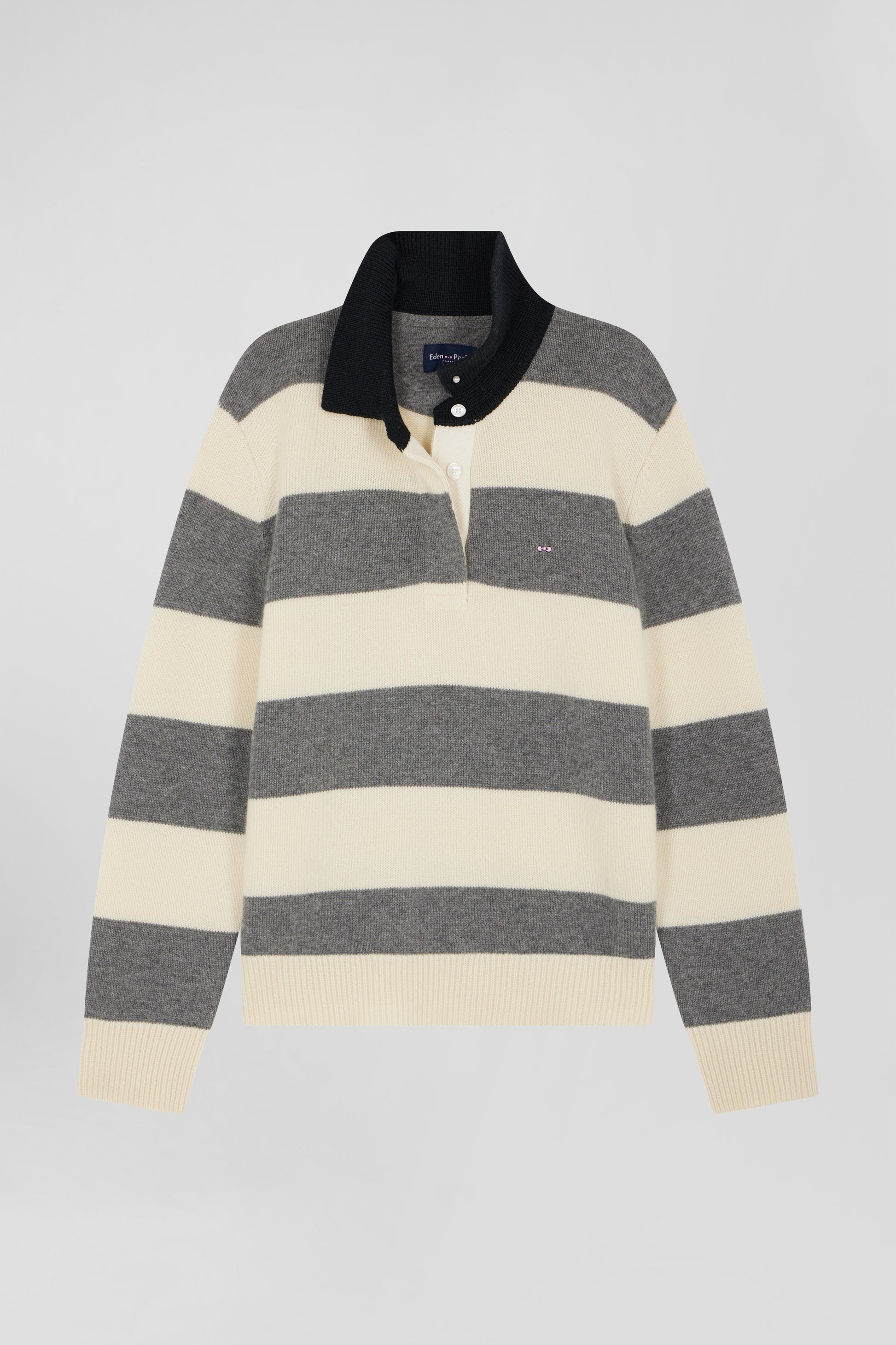 Add a modern touch to your winter wardrobe with this women's striped sweater, the perfect embodiment of Eden Park style. Crafted in wool and cashmere, it features elegant light-gray and ecru stripes, enhanced by a contrasting collar. Its relaxed fit and refined design make it ideal for a chic, cosy look, whether at the office or at the weekend.
