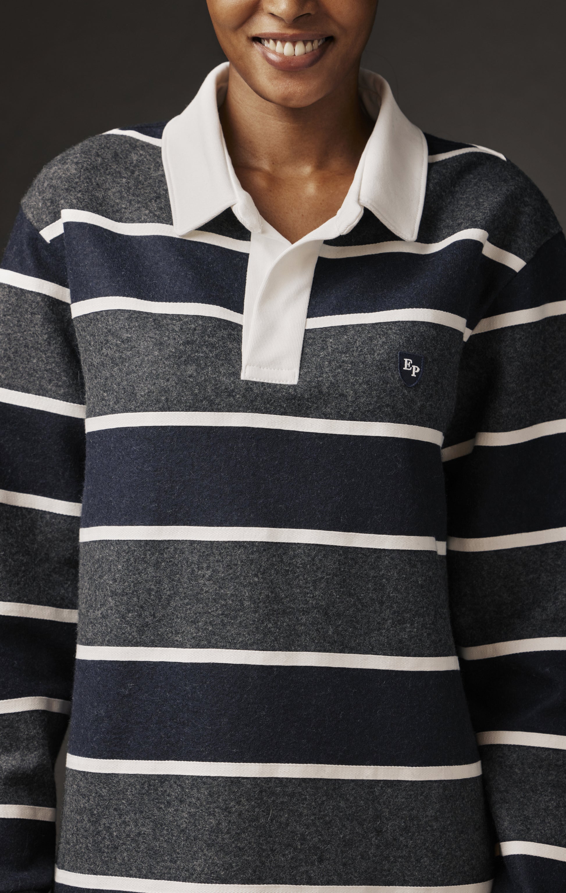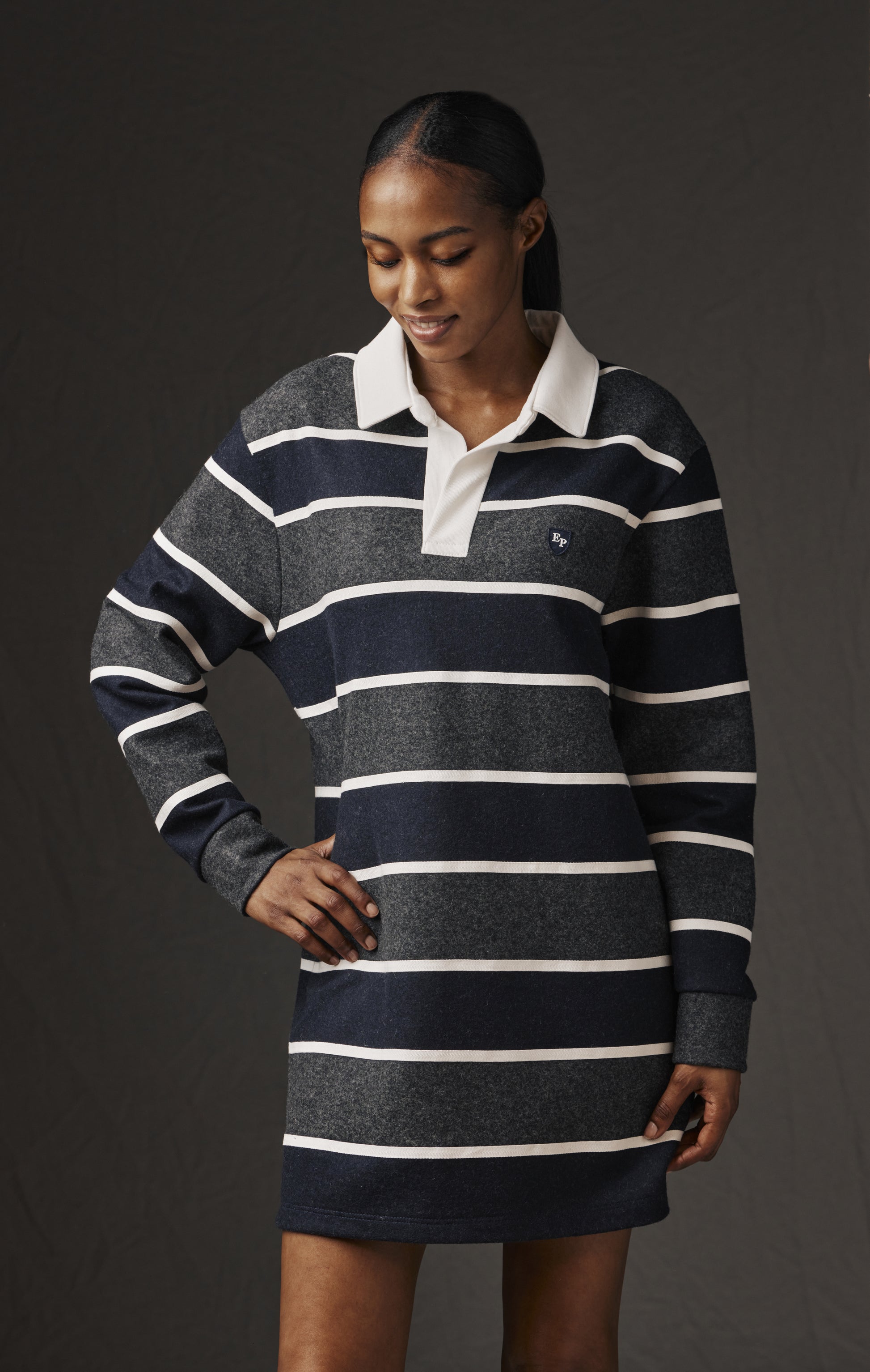 Création originale de notre atelier parisien pour la nouvelle collection capsule Pap’Atelier, cette robe revisite l’esprit du maillot de rugby Eden Park avec audace et féminité. Le tissu rayé bleu marine et gris est rythmé par de larges galons blancs cousus en superposition, apportant de la lumière et l’illusion de nouvelles rayures. L'intégralité de ces matériaux est issue de nos stocks dormants, tous sont découpés avant d'être assemblés main avec minutie. Une chute de tissu blanc a été transformée en col et en plaquette de boutonnage épurée, sans boutons, pensée comme un élégant décolleté. Sur la poitrine, l’écusson Eden Park affirme l’identité sport-chic de cette robe rayée. Imaginée à partir de matériaux exclusivement issus de nos stocks dormants, cette robe (taille M d'une longueur de 86 cm) conjugue rareté, caractère et durabilité, pour un style qui ne passe pas inaperçu. Son seul et unique exemplaire est proposé sur notre site pour une durée limitée.
