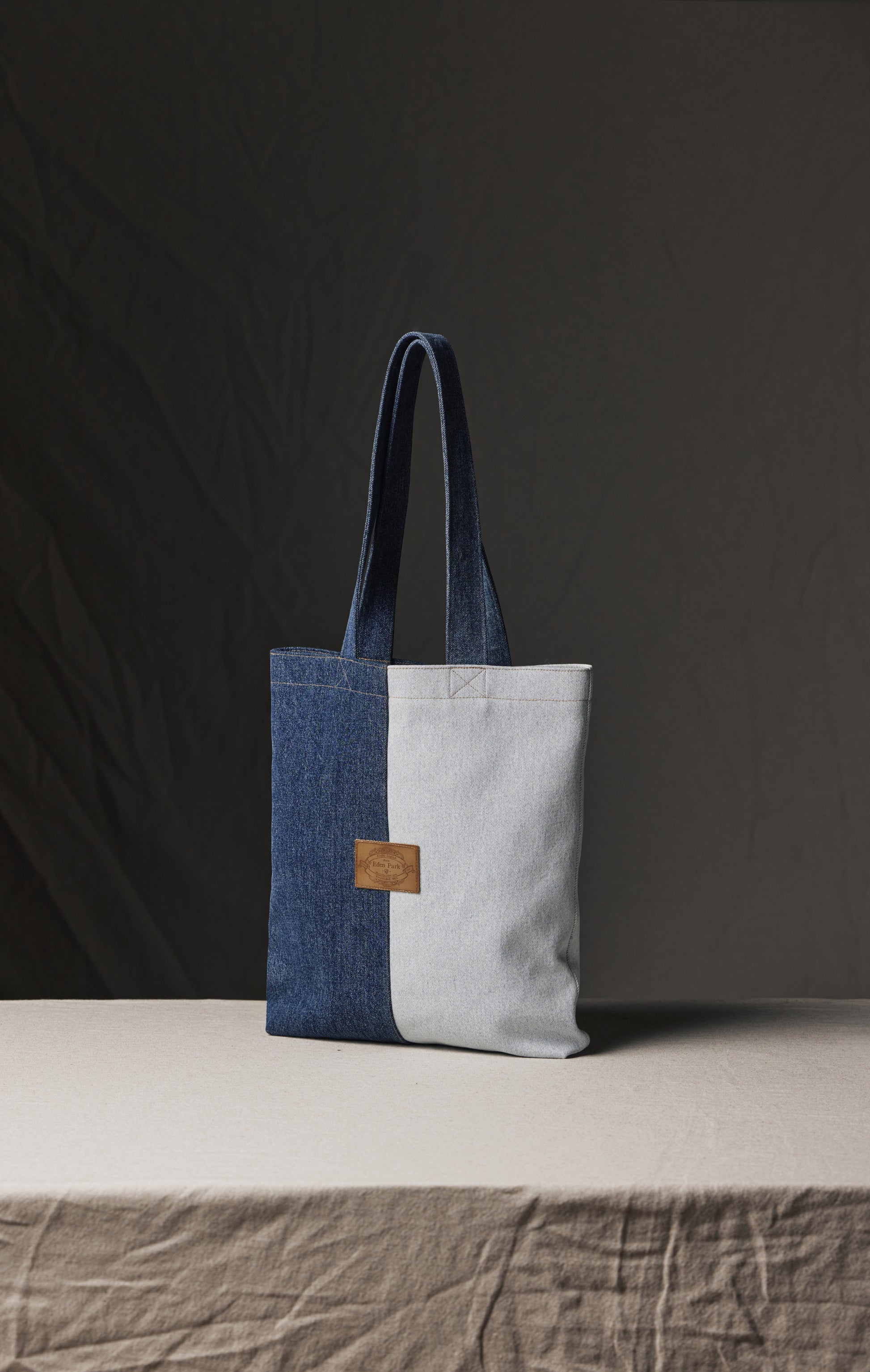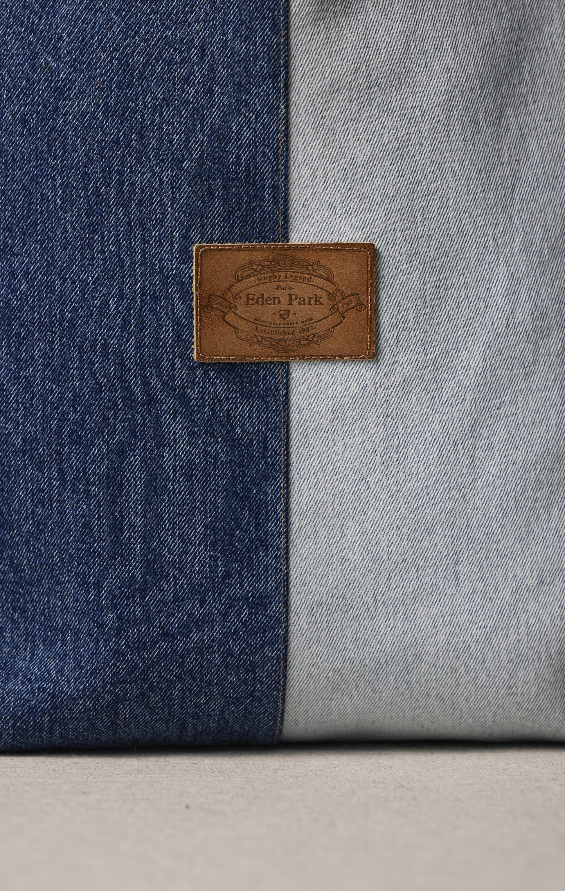 This two-tone tote bag was designed in our workshop from the same archival jeans upcycled to create the tote bag and bob for this Pap'Atelier capsule collection. Light denim and raw denim are assembled in a vertical contrast, inspired by the Japanese rugby jerseys in the Eden Park collections, and embellished with a leather label taken from a pair of jeans. Faithful to our desire to make the most of every resource, this graphic bag features a streamlined silhouette and sturdy construction. A faithful daily ally, this practical yet elegant tote bag features an interior zipped pocket, which promotes recycling, and a canvas lining also taken from our archives. This tote bag reflects creative and committed fashion, designed to give a second life to existing materials. Offered as a limited edition on our website, this model celebrates the rarity and craftsmanship of our fashion house. Dimensions: 37 cm x 40cm