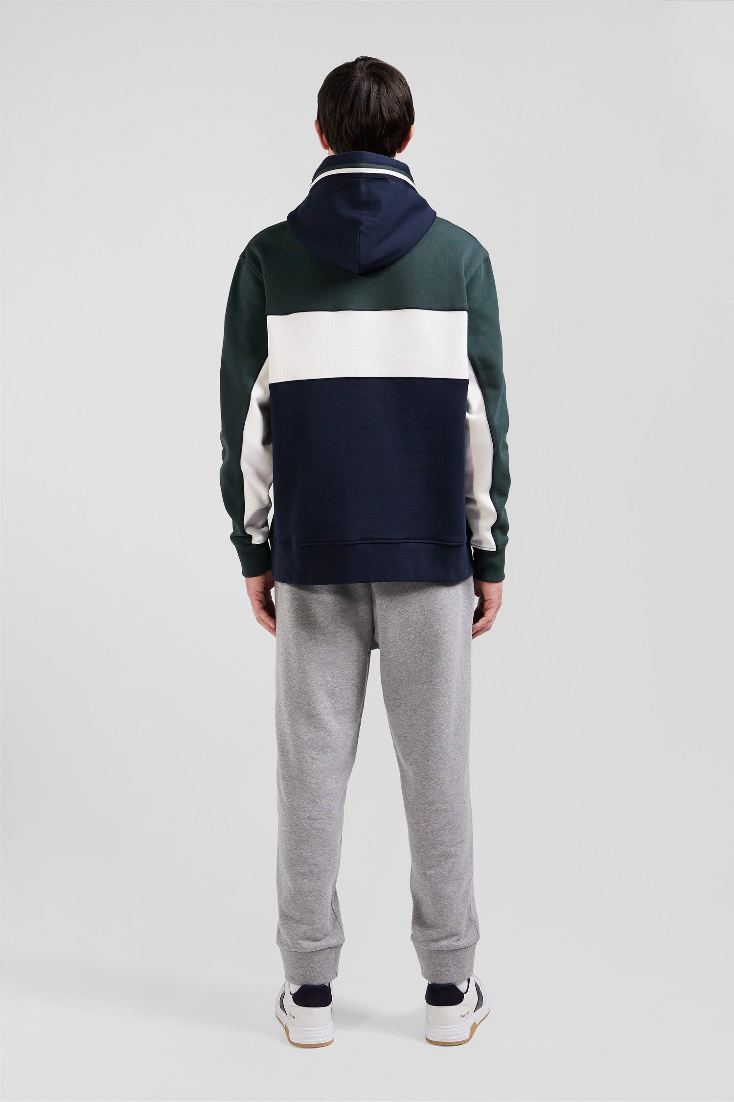 Opt for our tricolored hooded sweatshirt, a must-have for any fashionista. Made from brushed fleece, it offers incomparable softness. Elegant piping highlights the sleeve cut-outs, while the Eden Park French Flair lettering asserts its identity. A knitted ribbon applied around the hood adds a touch of refinement to this hoodie, perfectly fusing comfort and style.