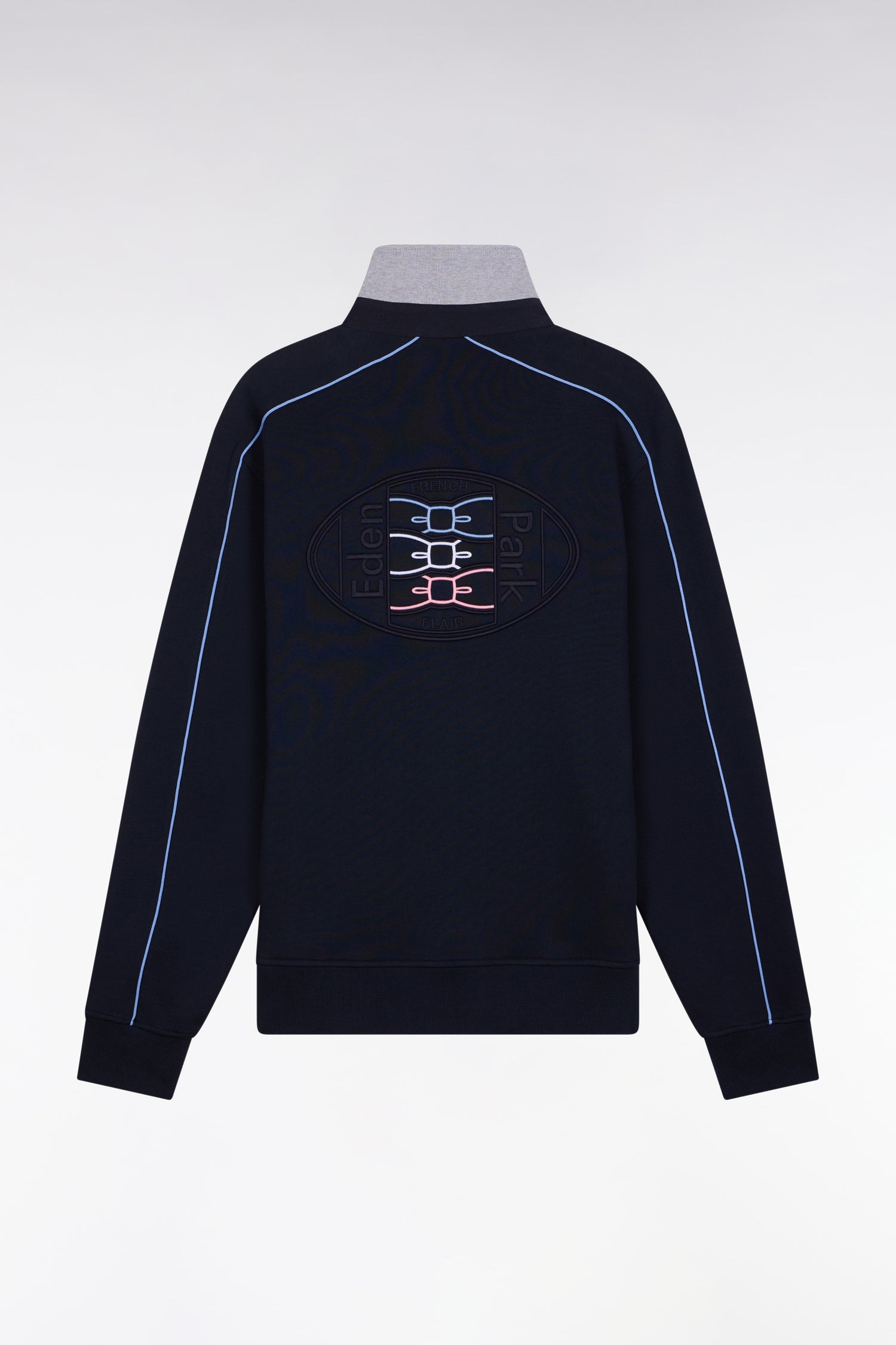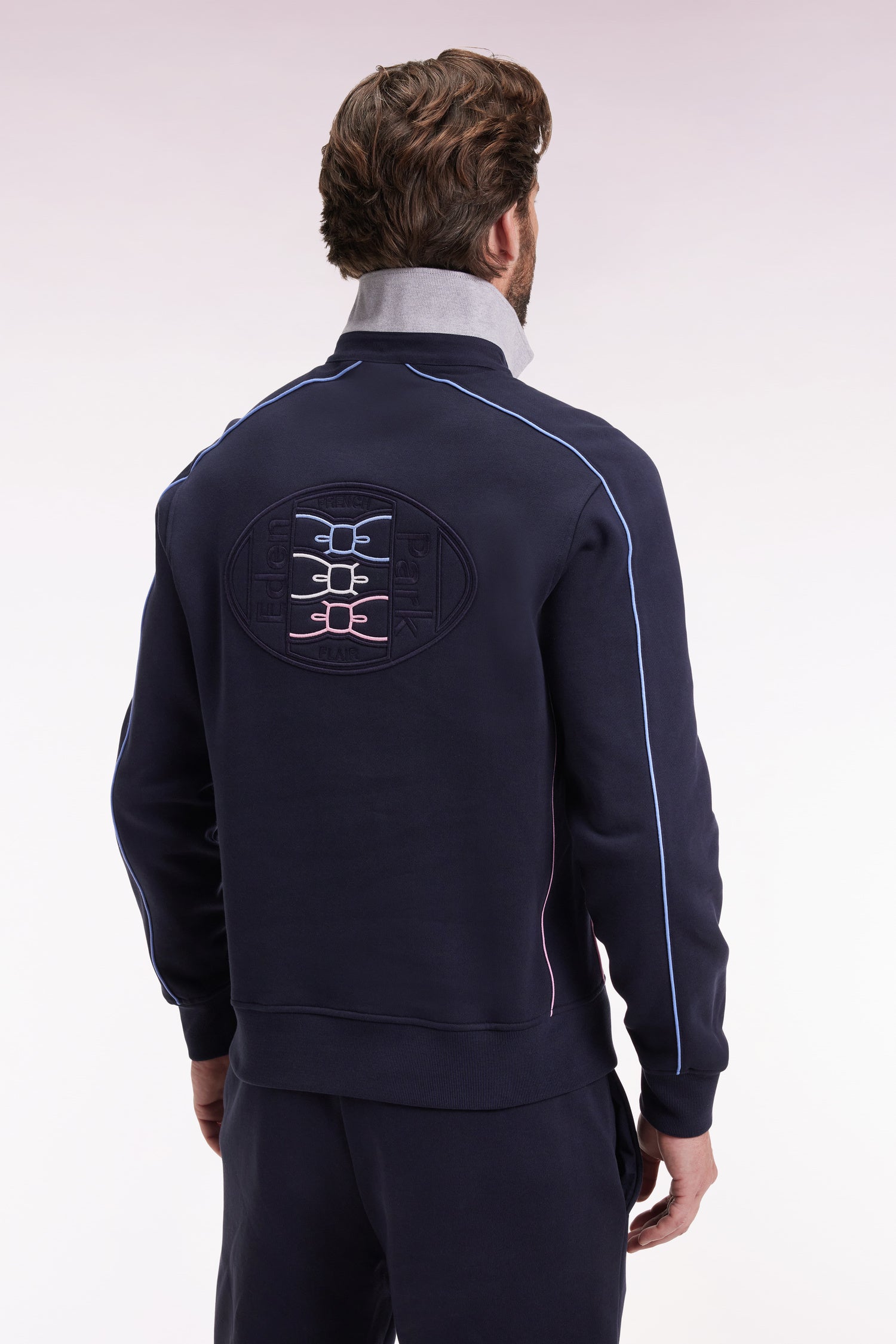 Inspired by our House's iconic rugby jerseys, this brushed fleece sweatshirt revisits sporting codes with a fashionable twist. Its twill jersey collar, contrasted by a gray ribbed underside, frames a silhouette punctuated by colored piping along the sleeves. Back embroidery with raised contours asserts an assertive graphic character. Ribbed trims provide support and comfort.