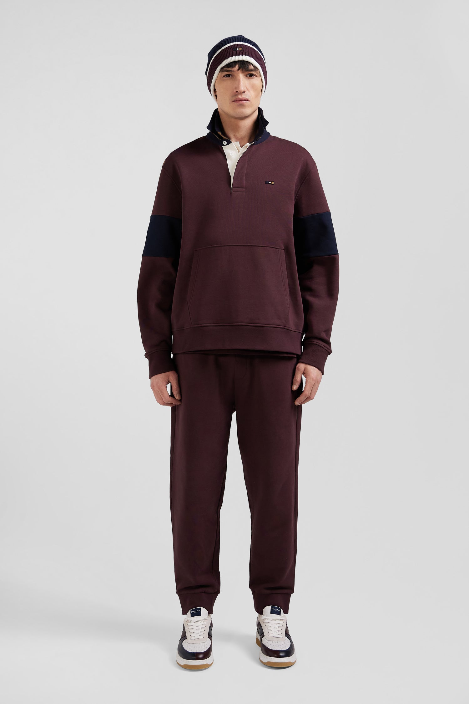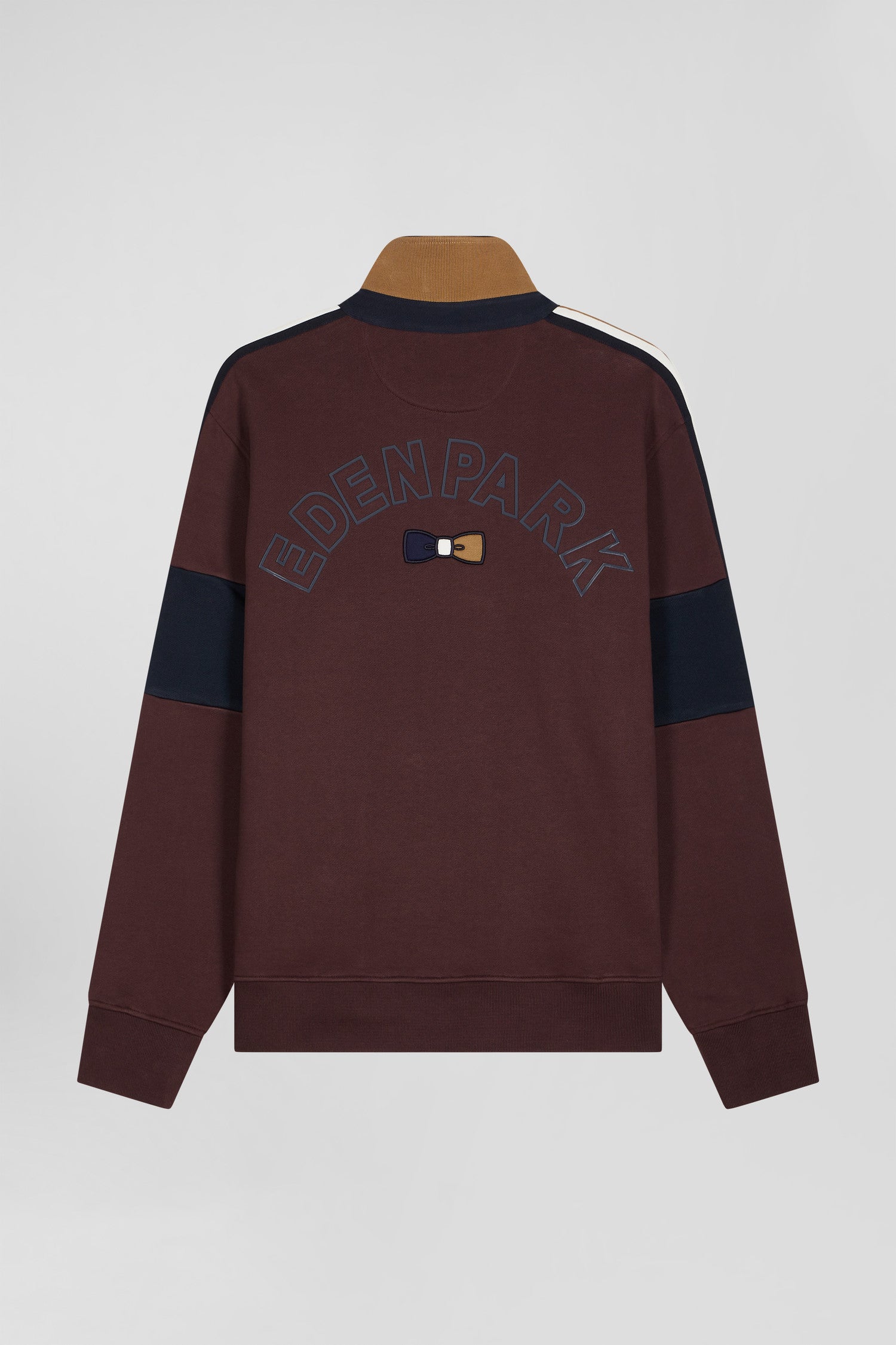 Our men's sweatshirt, available in black or burgundy, is designed in brushed fleece for optimum comfort. Cuff cutouts on the sleeves and a rugby jersey collar in twill, lined with knitted ribbing, add a sporty touch. A tricolored knitted ribbon runs along the shoulders, while the back proudly features EDEN PARK lettering and a tricolored embroidered bow, topped with a fabric applique.