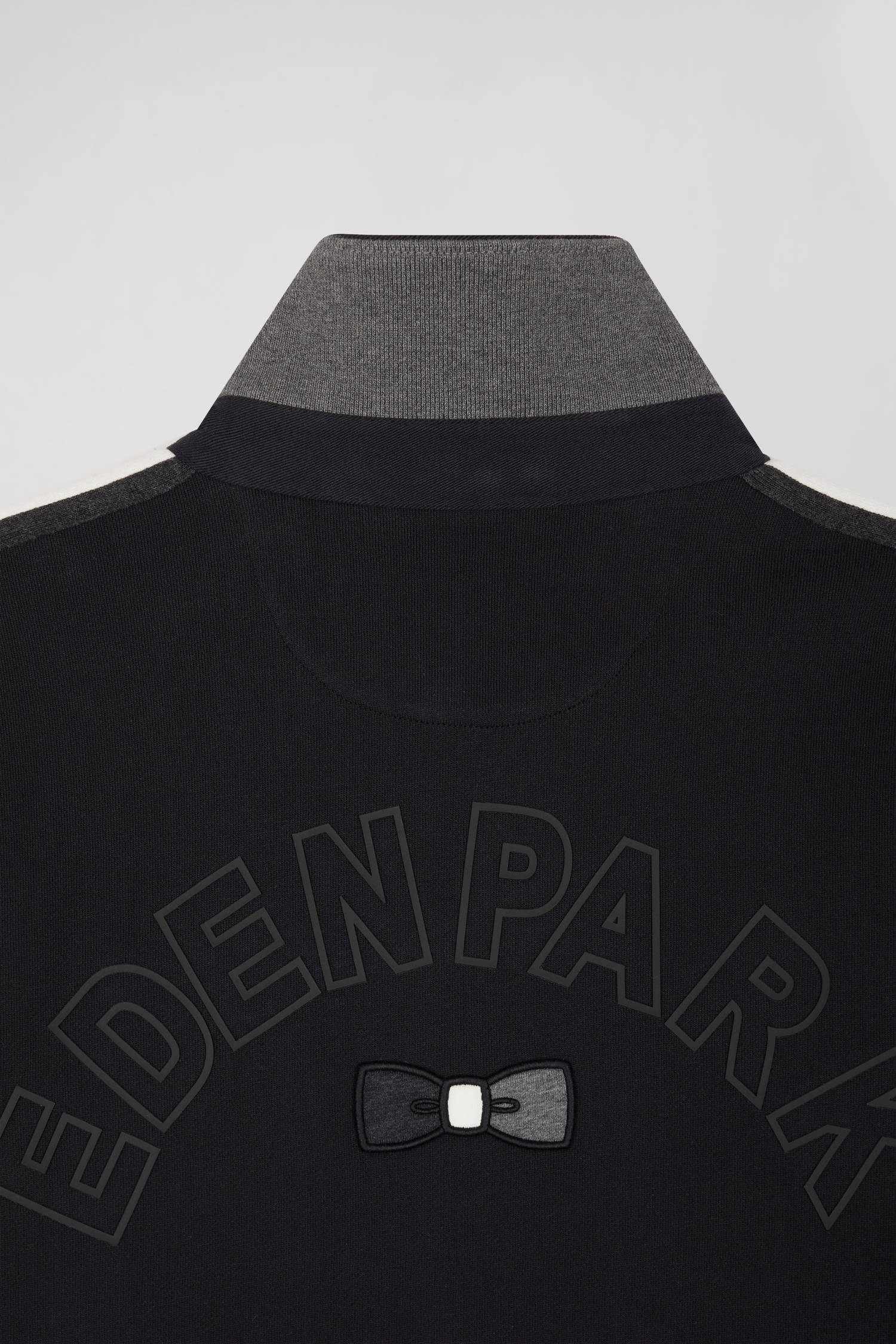 Our men's sweatshirt, available in black or burgundy, is designed in brushed fleece for optimum comfort. Cuff cutouts on the sleeves and a rugby jersey collar in twill, lined with knitted ribbing, add a sporty touch. A tricolored knitted ribbon runs along the shoulders, while the back proudly displays EDEN PARK lettering and a tricolored embroidered bow, topped with a fabric applique.