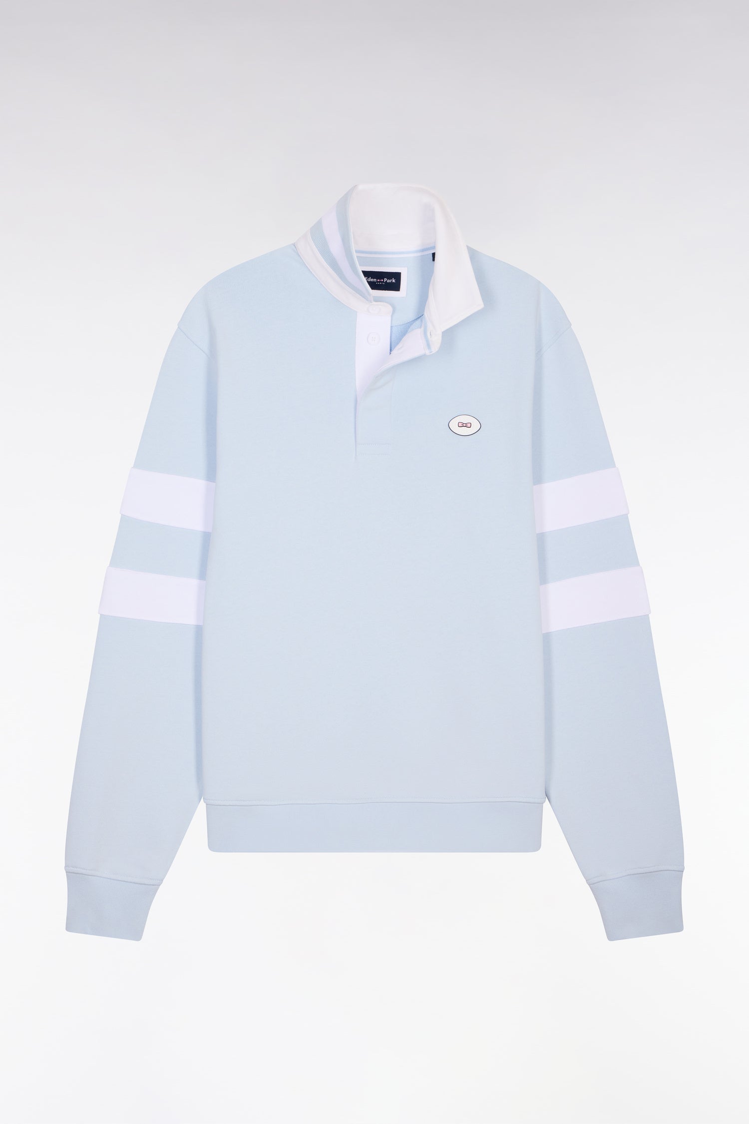 Ce sweatshirt homme revisite l’iconique maillot de rugby dans une version contemporaine adapté à l'extérieur du terrain. Le col maillot contrasté à dessous de col rayé, les bandes découpées bicolores sur les manches et le badge poitrine signent une silhouette sport chic lumineuse. Confectionné dans un molleton doux, ce sweatshirt apporte une touche preppy idéale pour les looks décontractés de mi-saison. Un modèle intemporel masculin offert en ciel, rose ou marine. À Porter avec un jean ou son short en molleton pour un total look d'inspiration retour de l'entrainement.