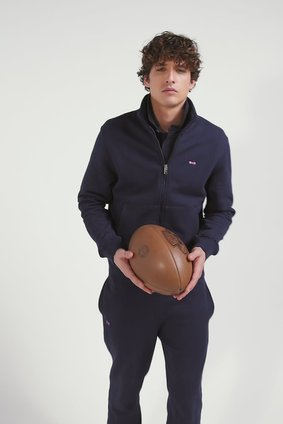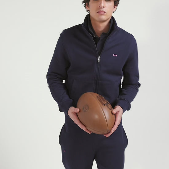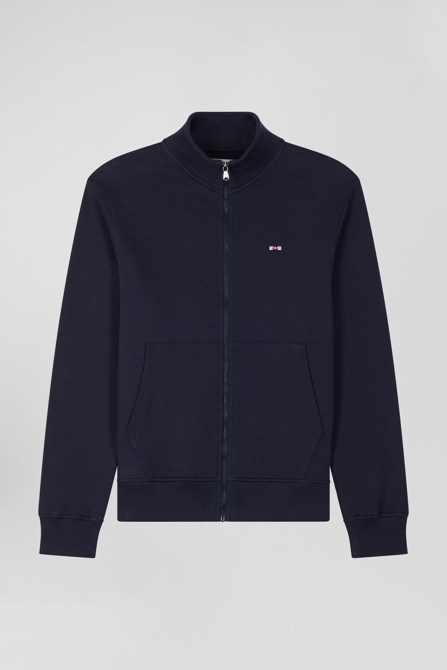 Regular navy zipped brushed cotton fleece with high top collar
