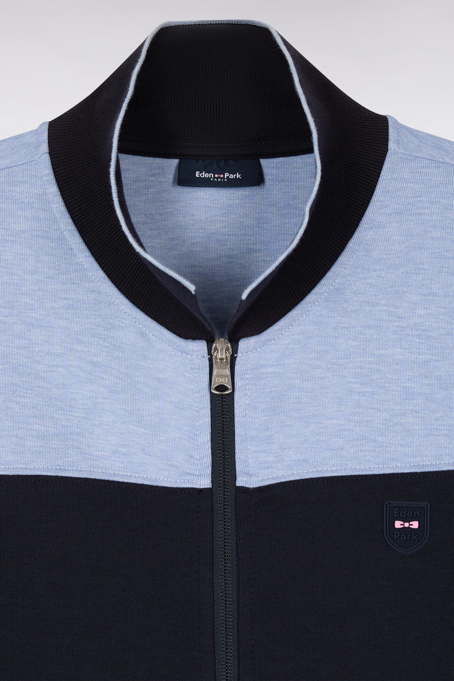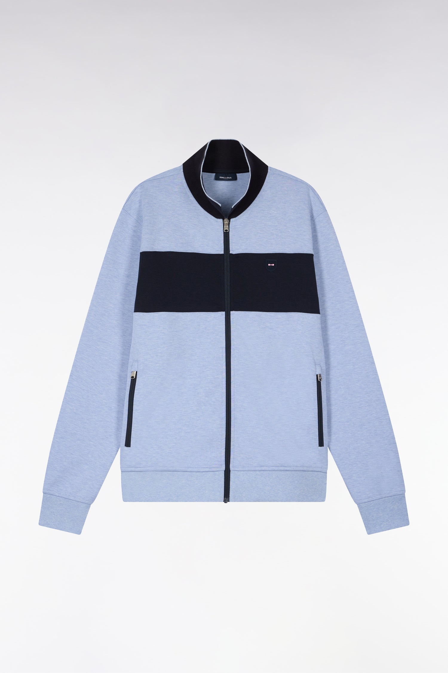 Ce sweatshirt zippé en molleton doux et confortable incarne l’ADN rugby de notre Maison revisité à l'épreuve de la ville. Sa coupe droite et son col polo souligné d'un fin liseré contrasté lui confèrent une allure moderne, tandis que le badge écusson en gomme sur la poitrine signe son appartenance à notre vestiaire sport-chic hommage au rugby. Une bande contrastée sur la poitrine dynamise la silhouette masculine. Ce sweatshirt zippé bicolore est disponible en ciel et marine ou en marine à détails roses. À Associer à un jean ou en total look avec son jogging coordonné pour votre quotidien.