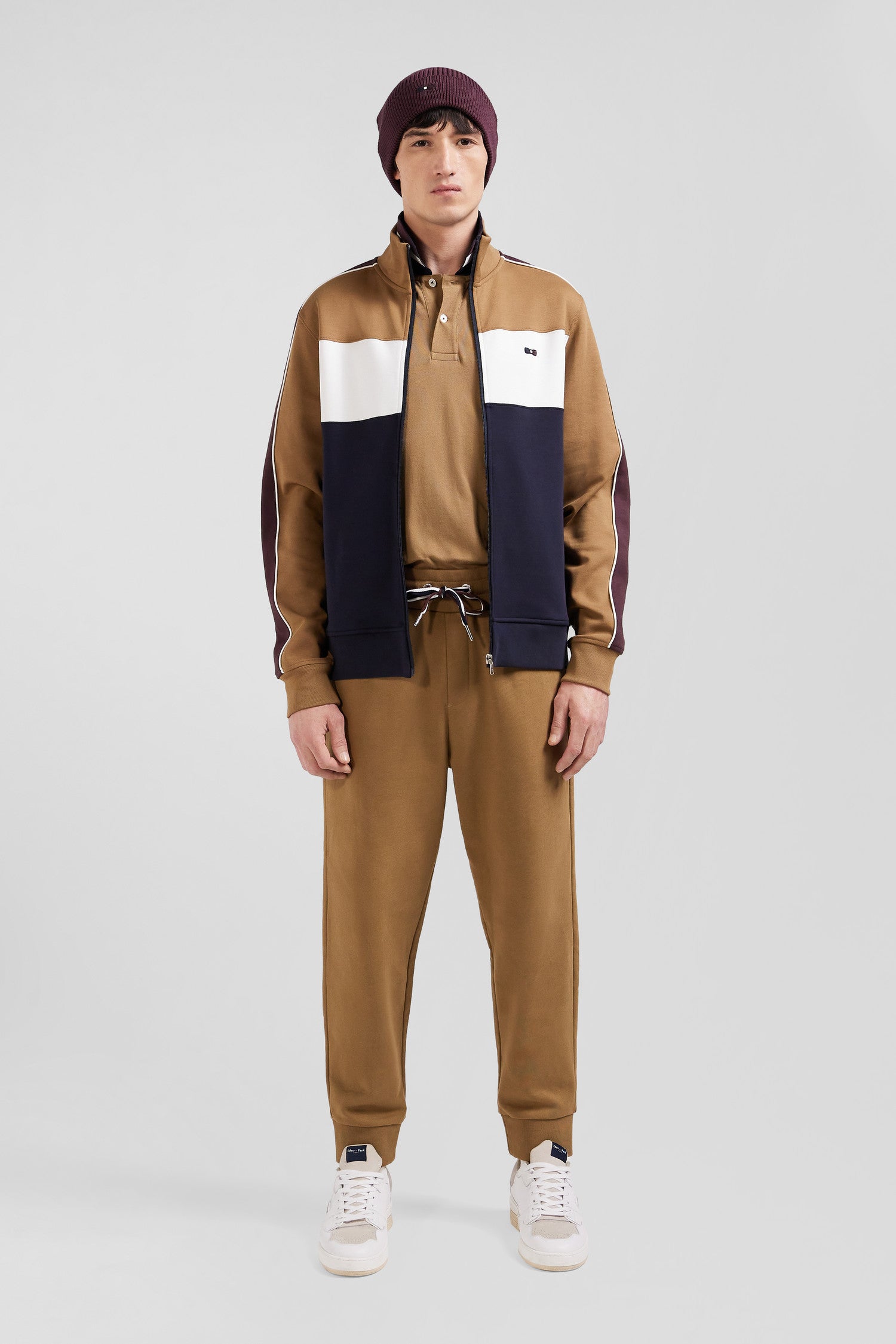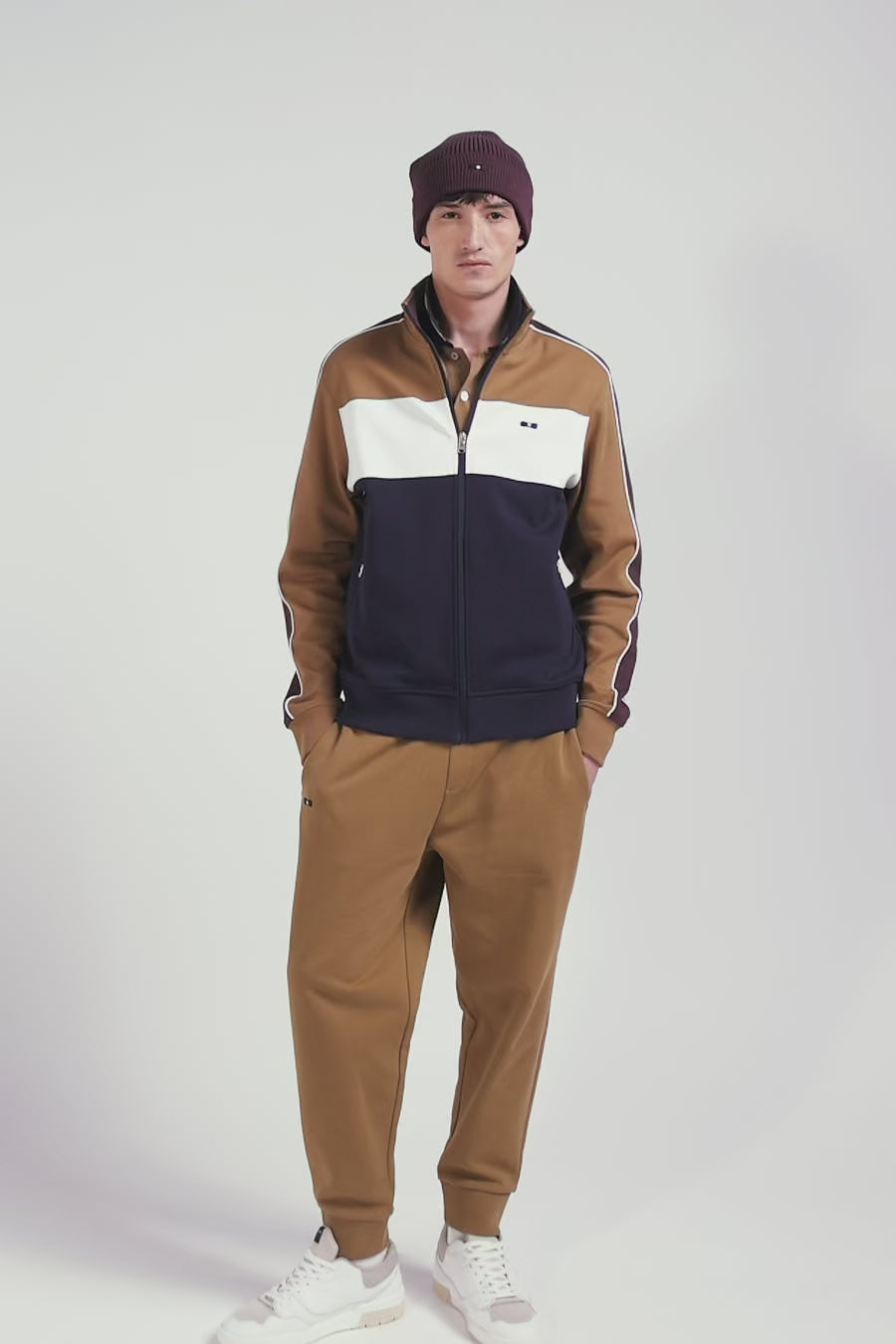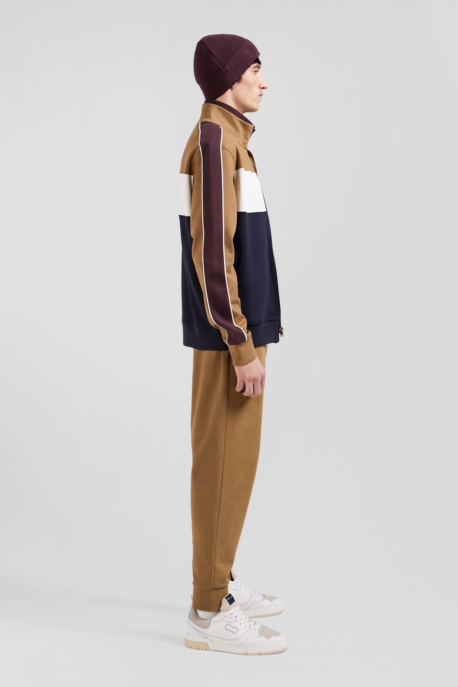 Colorblock zip-up sweatshirt in hazelnut cotton blend, regular fit