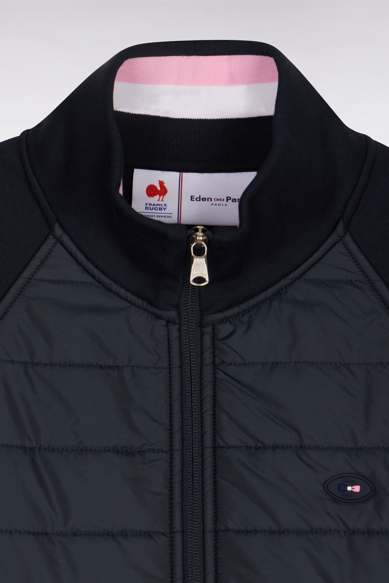 Ce sweatshirt zippé XV de France se distingue par sa parementure frontale matelassée qui évoque les équipements d’entraînement mais aussi nos doudounes masculines. Le contraste entre les manches en molleton et la parmenture texturée apporte un esprit technique chic pour un quotidien urbain. Une pièce hybride, idéale comme veste légère en intersaison ou à porter en sweatshirt structuré.