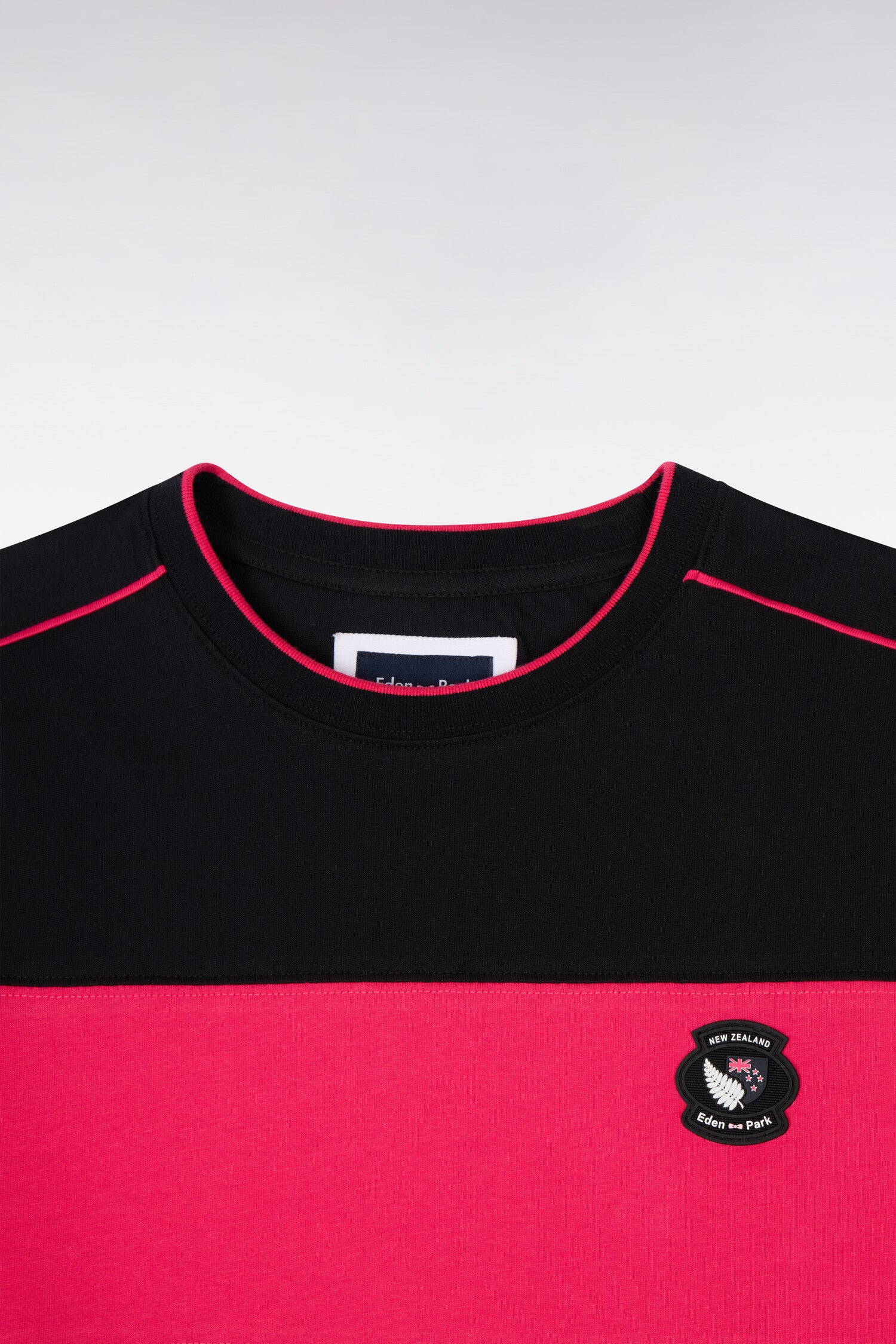 Ce T-shirt homme de notre capsule New Zealand est confectionné en jersey de coton blanc ou noir et se distingue par ses découpes et passepoils contrastés, noirs ou fuchsia selon le coloris choisi, et son badge sur la poitrine. Ses finitions bords-côtes rayées affirment son style sport-chic emblématique de nos créations.