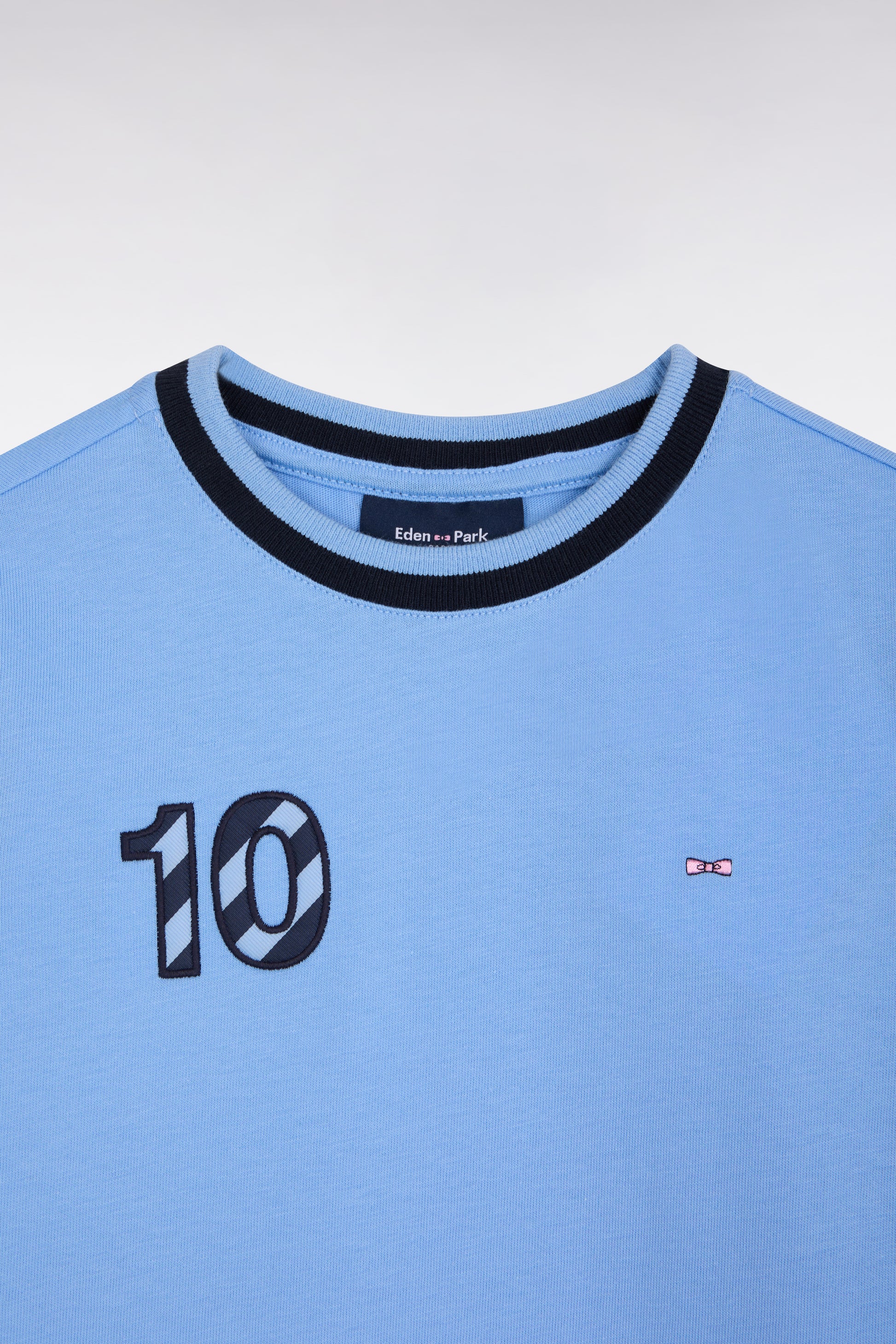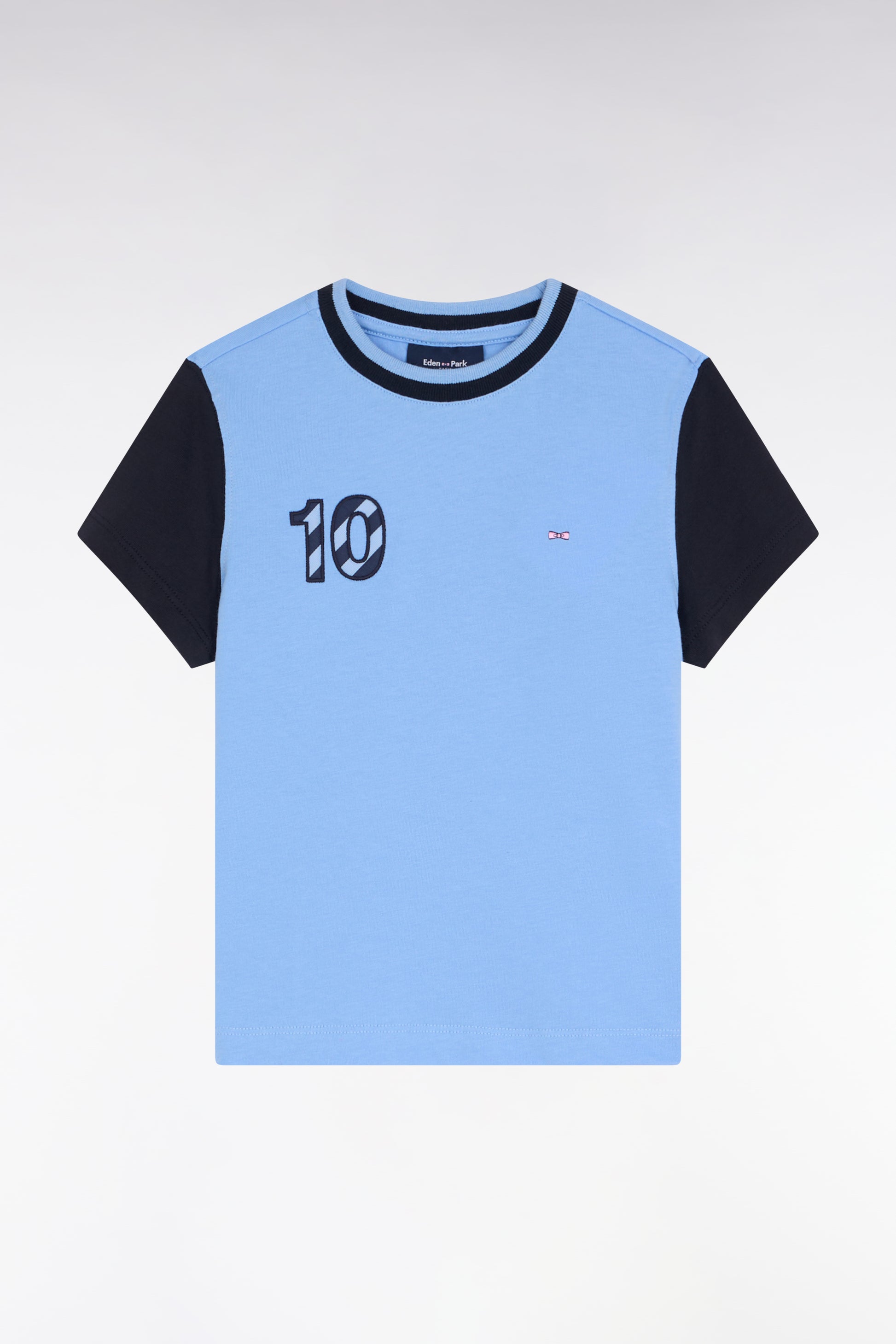 This short-sleeved children's T-shirt features a characterful design with contrasting navy sleeves and iconic embroidery. The embroidered bow tie on the chest is complemented by 10-point embroidery and striped tie fabric, a nod to Eden Park rugby codes. Made in soft cotton jersey, it combines comfort and style.