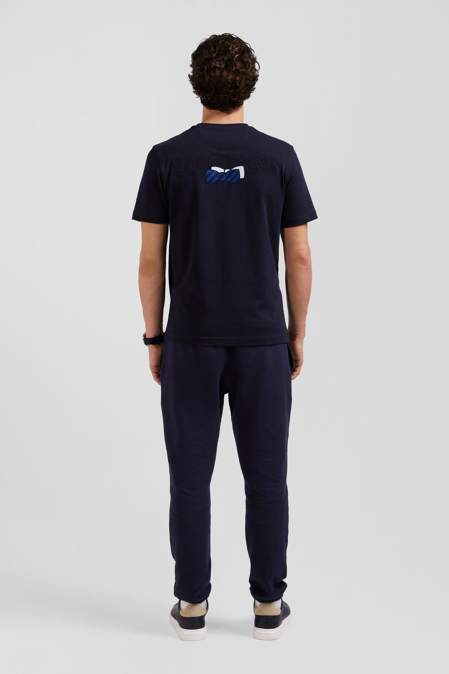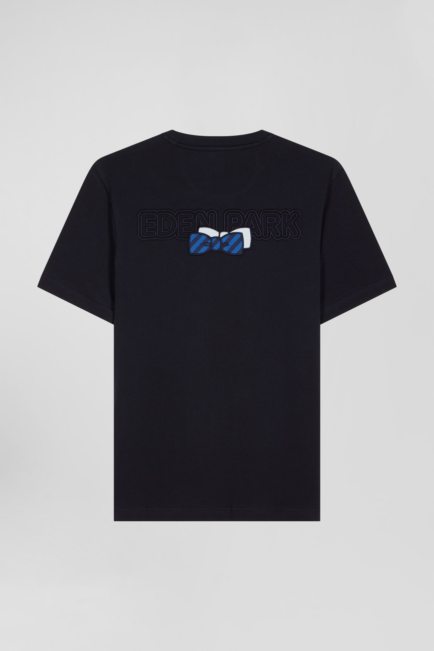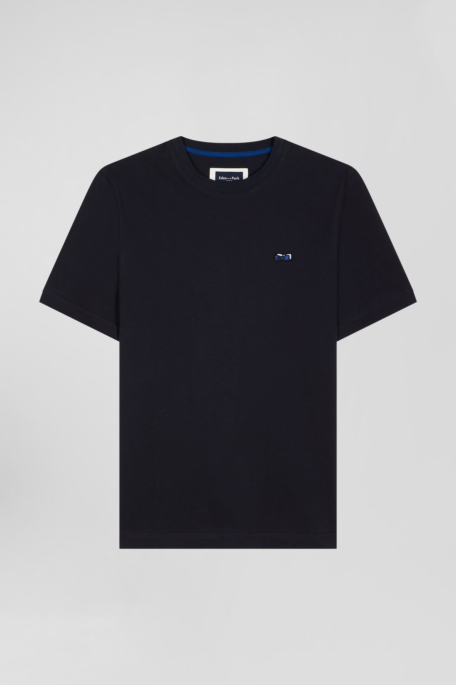 Regular navy blue short-sleeved cotton T-shirt with back embroidery