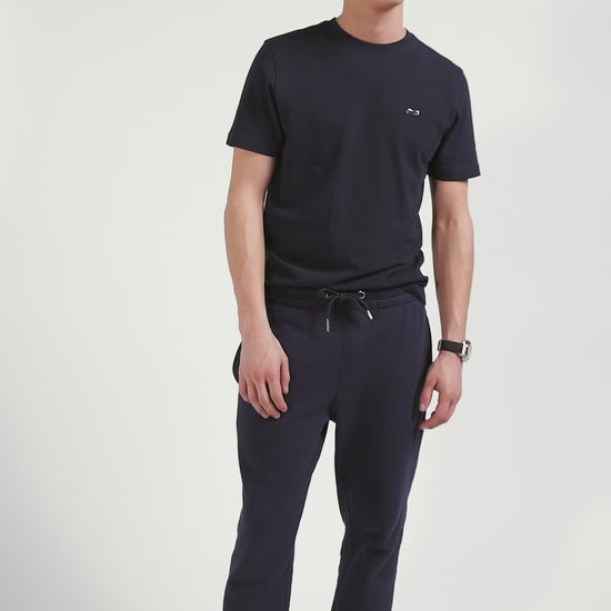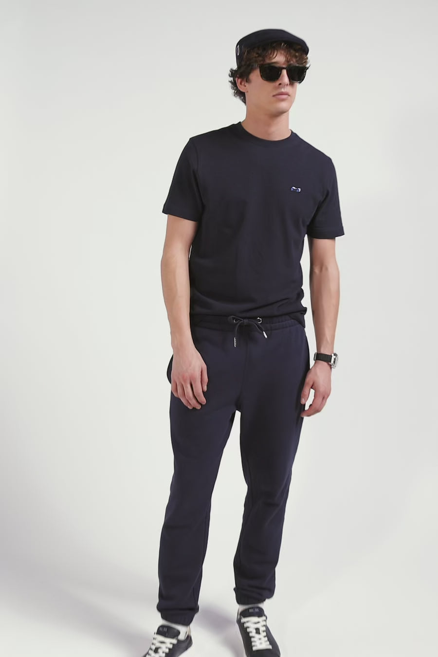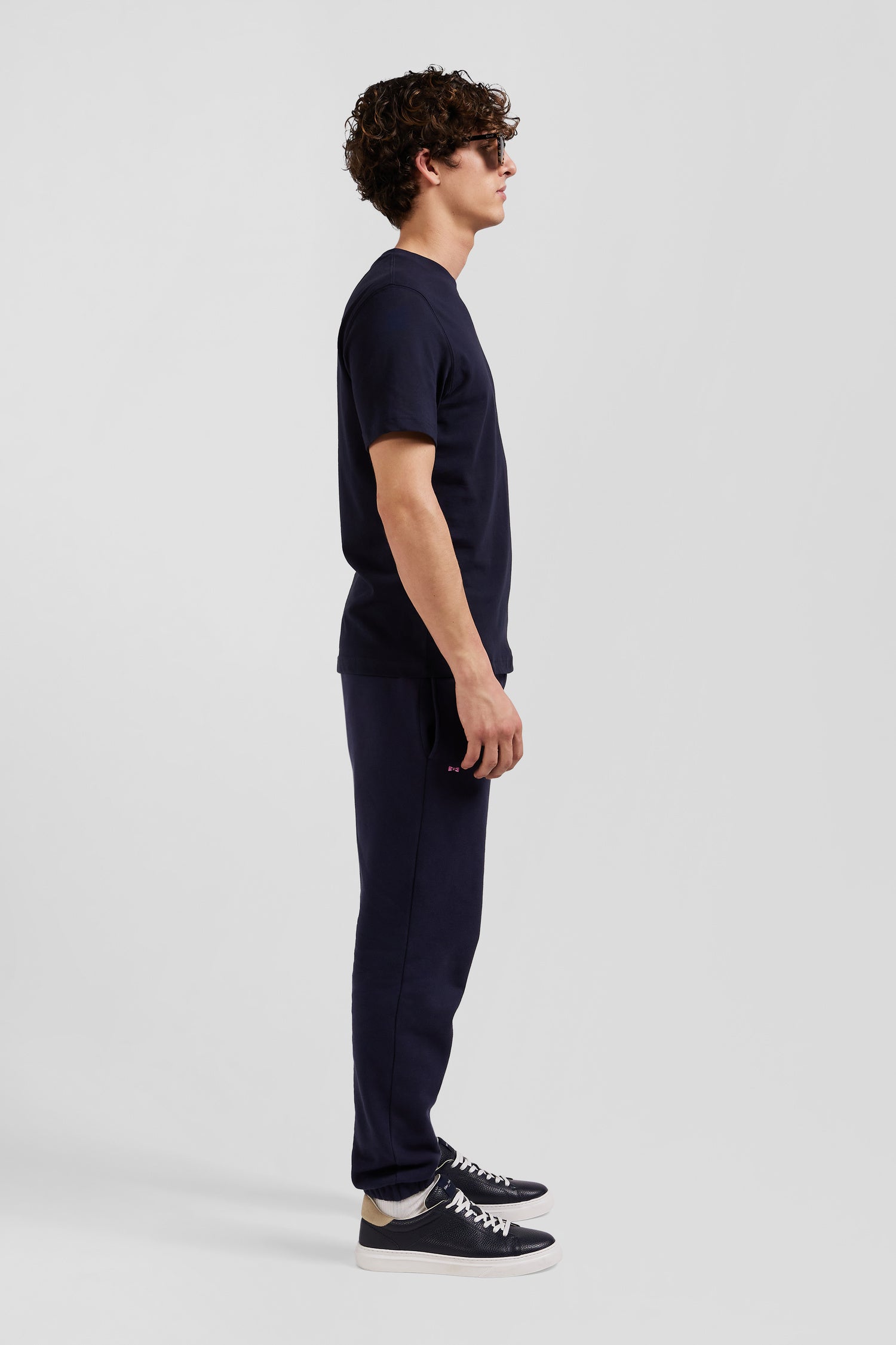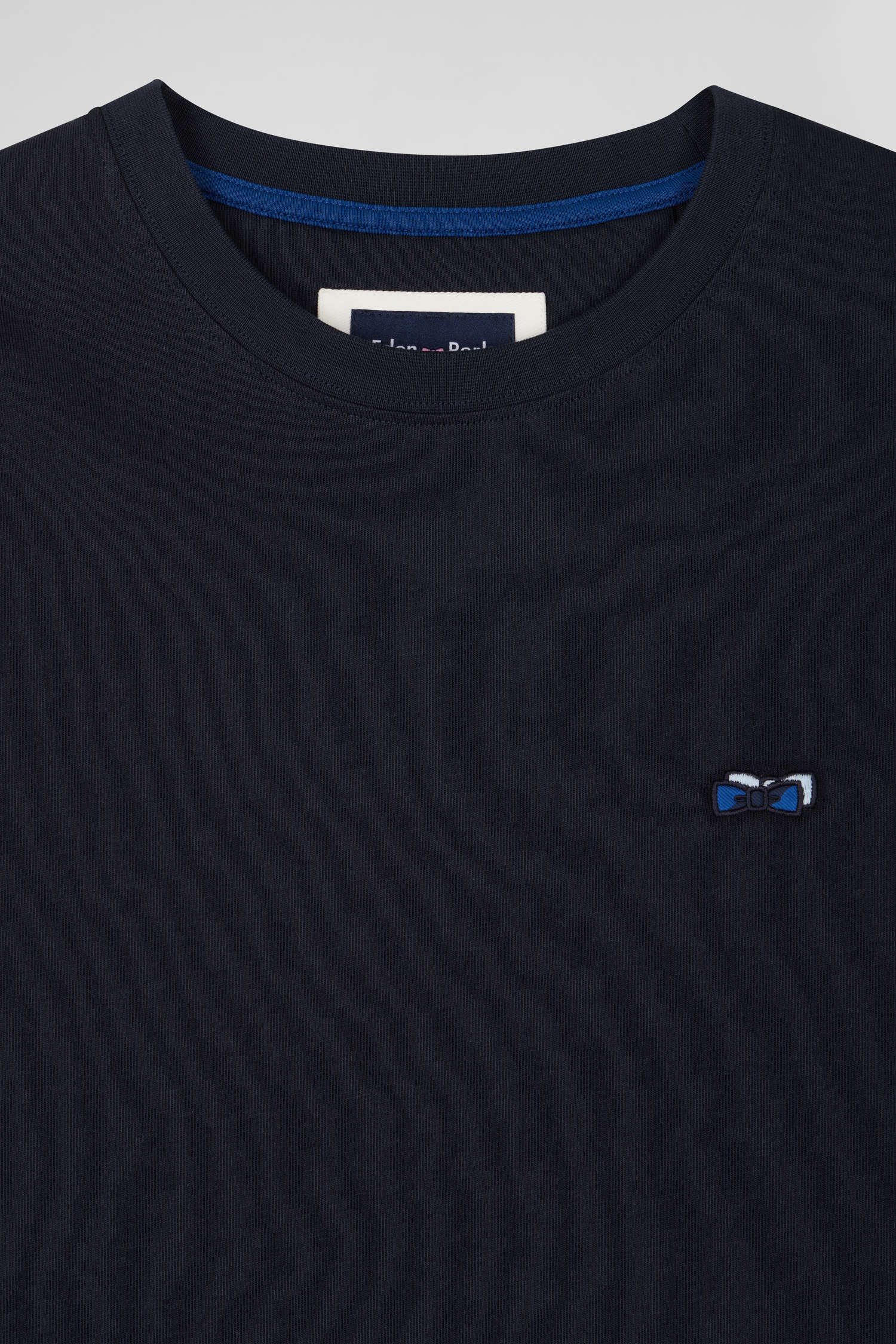 Regular navy blue short-sleeved cotton T-shirt with back embroidery