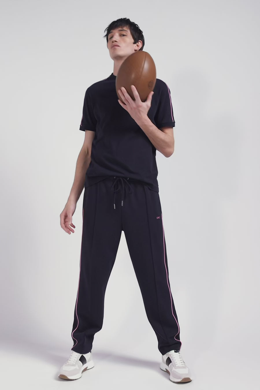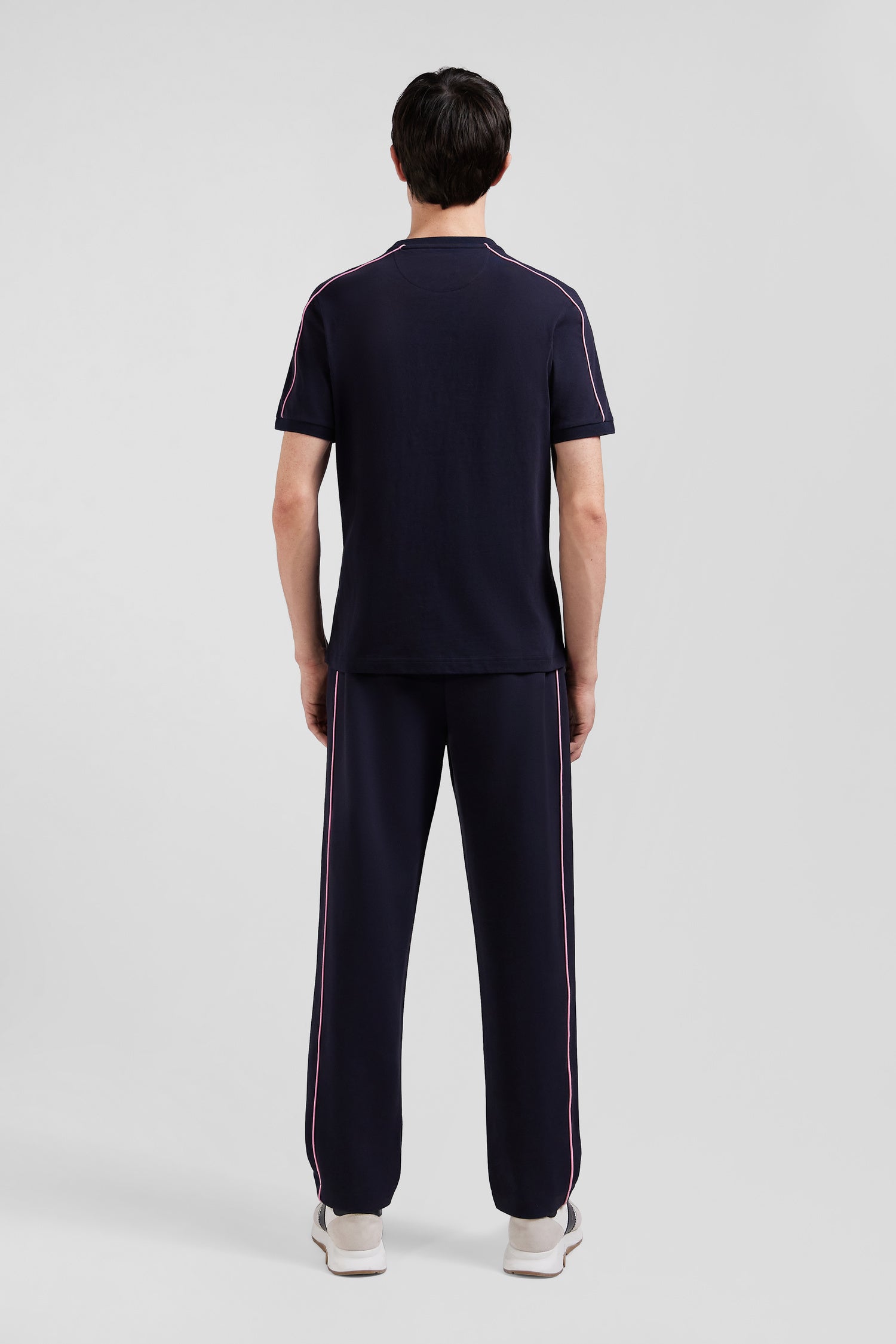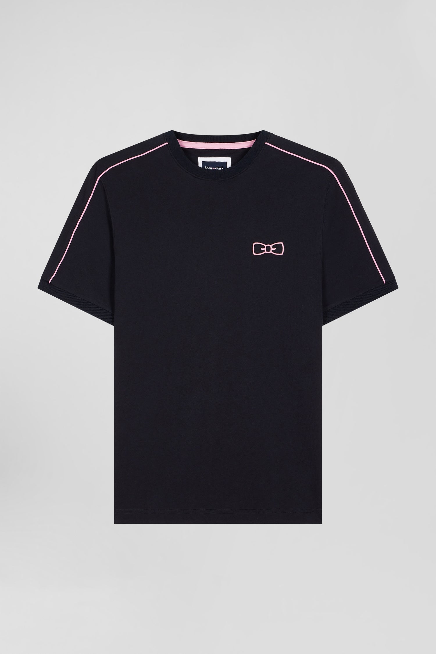 Regular navy short-sleeved cotton T-shirt with pink piping