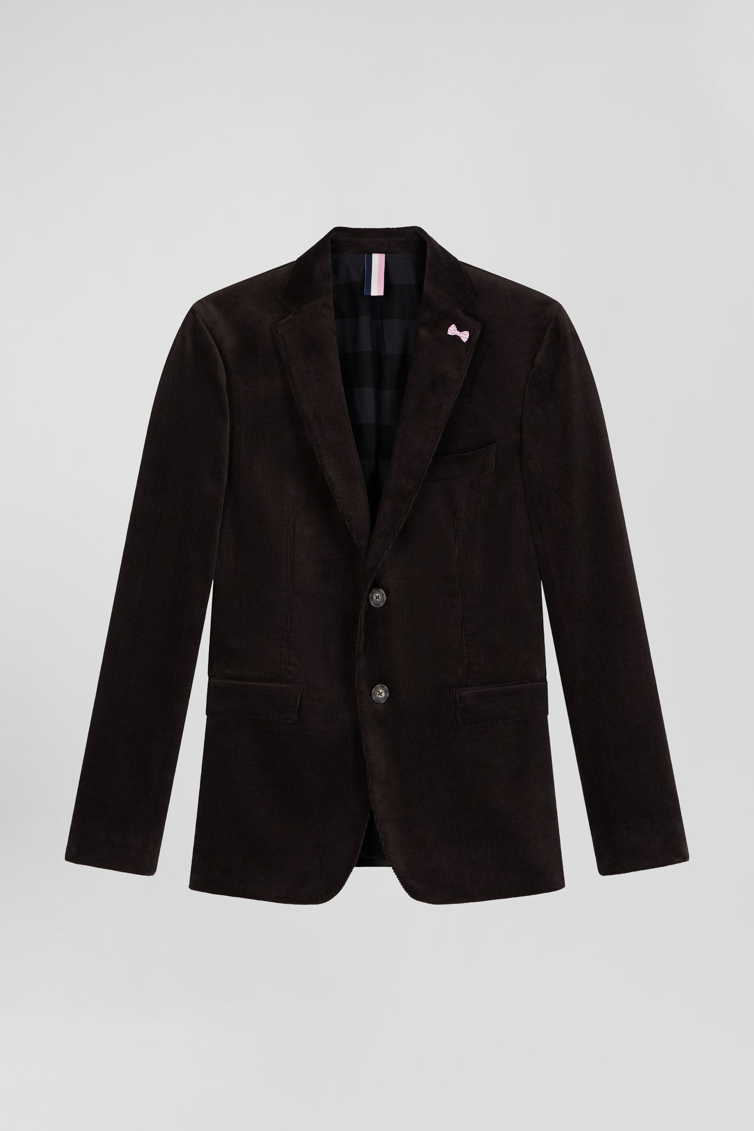 Our stretch cotton velvet jacket is perfect for adding a touch of sophistication to your wardrobe. This classic piece is enhanced by a hooped lining, adding Eden Park's signature subtle, elegant contrast. It features two flap pockets and a chest pocket, while a side slit ensures optimum freedom of movement. Ideal for formal occasions or as a chic addition to casual attire in its timeless navy or brown colorway.